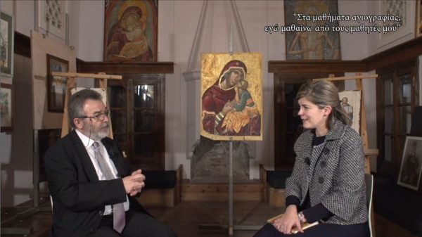 Επίσης αναφέρθηκε στα χρόνια που πέρασε στο πλευρό Αγιορειτών Μοναχών αλλά και στα όσα αποκόμισε από τα 40 έτη διδασκαλίας της Βυζαντινής Αγιογραφίας.