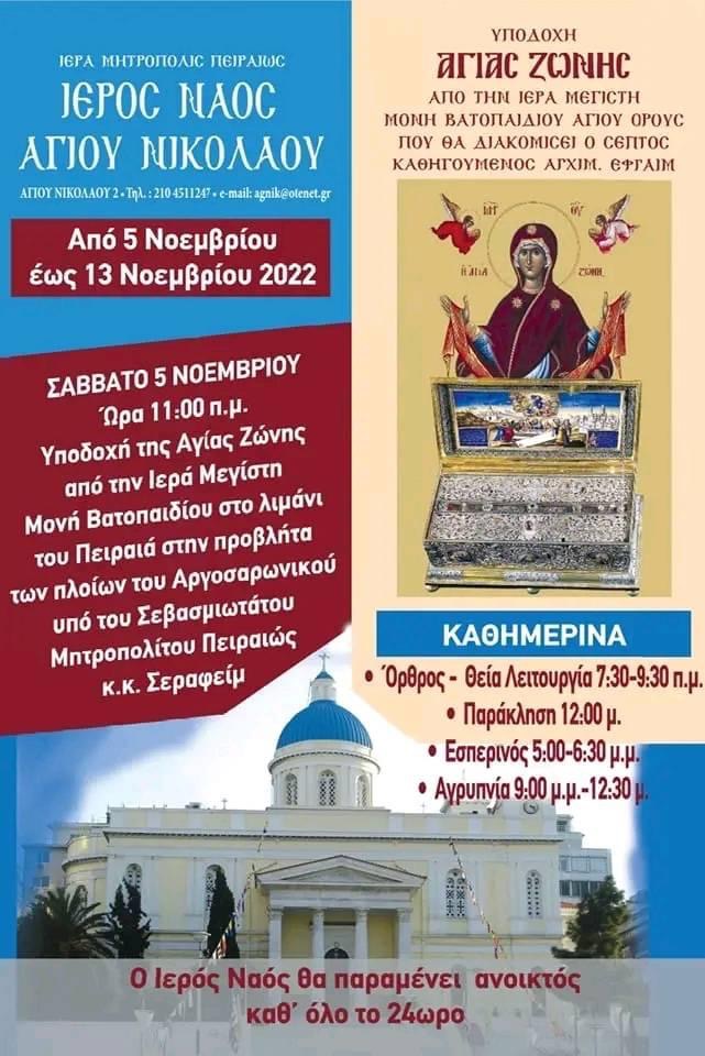 Το μοναδικό θεομητορικό κειμήλιο που σώζεται από την επίγεια ζωή της Παναγίας μας και φυλάσσεται στην Ιερά Μεγίστη Μονή Βατοπαιδίου, εξήλθε από το Άγιον Όρος προς ευλογία των πιστών του Πειραιά και όχι μόνο καθώς, σε κάθε έξοδό της, χιλιάδες συρρέουν από κάθε γωνιά της Ελλάδας, ακόμη και από το εξωτερικό, για να λάβουν τη χάρη της, να ακουμπήσουν τον πόνο τους αναζητώντας την ελπίδα στις δύσκολες ημέρες που περνά η ανθρωπότητα. Μάλιστα είναι η πρώτη η πρώτη φορά που η Αγία Ζώνη βγαίνει από το Άγιον Όρος μετά την περίοδο της πανδημίας του κορωνοϊού. H τελευταία φορά που η Αγία Ζώνη είχε έρθει στο λεκανοπέδιο της Αττικής ήταν πριν πέντε χρόνια, το 2017, στην Ιερά Μητρόπολη Νέας Ιωνίας και Φιλαδελφείας με την ανταπόκριση των πιστών να είναι μεγάλη.