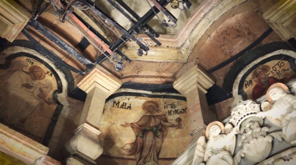 Μπαίνοντας στο Ιερό Κουβούκλιο στον προθάλαμο όπου είναι το παρεκκλήσι του Αγγέλου, εκεί δηλαδή που στάθηκε ο Άγγελος σύμφωνα με τις Γραφές τις κρίσιμες στιγμές μετά την ταφή του Χριστού φαίνονται δυο αγιογραφίες αρχαγγέλων, μια αγιογραφία της Θεοτόκου και αγιογραφίες των Μυροφόρων: H Μαρία του Κλωπά, η Μαρία η Μαγδαληνή, η Μάρθα, η Σαλώμη, η Σωσάνα και η Ιωάννα, κρατούν στα χέρια τους μύρα για να αλείψουν το σώμα του Χριστού καθώς πήγαιναν στον Τάφο του, πριν μάθουν πως αναστήθηκε!