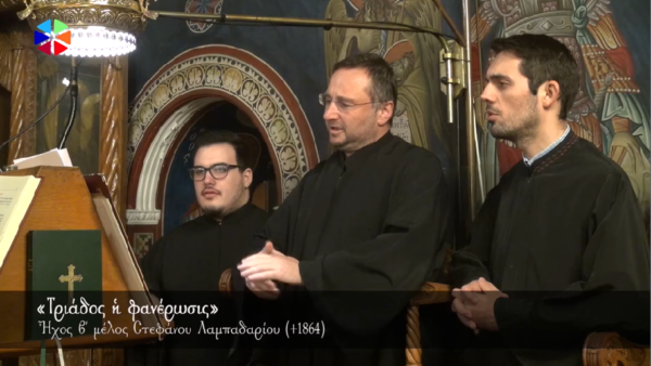Ο Δημήτρης Μανούσης, Πρωτοψάλτης του Ιερού Ναού Παναγίας Λαοδηγήτριας και Χοράρχης του Χορού Ψαλτών «Φιλαθωνίται» ψάλει το Ιδιόμελο των Θεοφανείων «Τριάδος η φανέρωσις» σε μέλος Στεφάνου Λαμπαδαρίου (+1864).