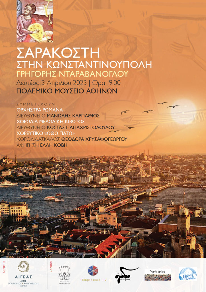 Συναυλία υπό τον τίτλο «Σαρακοστή στην Κωνσταντινούπολη» με τον κορυφαίο ψάλτη του Βυζαντινού Μέλους, Γρηγόρη Νταραβάνογλου, θα πραγματοποιηθεί τη Δευτέρα 3 Απριλίου 2023 στις 19:00 στο Πολεμικό Μουσείο Αθηνών.