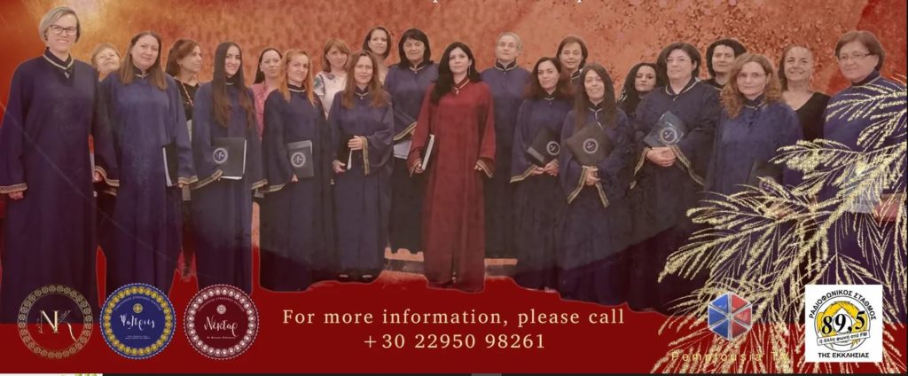 Τα μικρά κορίτσια της βυζαντινής χορωδίας “Νέκταρ” θα αποδώσουν, μεταξύ άλλων, τροπάρια από τον Κανόνα του Ιησού, όπως τα έψαλλε ο Άγιος Πορφύριος. Θα ερμηνεύσουν επίσης ύμνους των Χριστουγέννων και τα λειτουργικά του πλ.Α’ του Γεράσιμου Κανελλίδου. Η βυζαντινή χορωδία των Ψαλτριών θα ερμηνεύσει, μεταξύ άλλων, τις Καταβασίες των Χριστουγέννων και τον πολυέλεο “Δούλοι Κύριον” σε ερμηνεία Αθ. Καραμάνη.