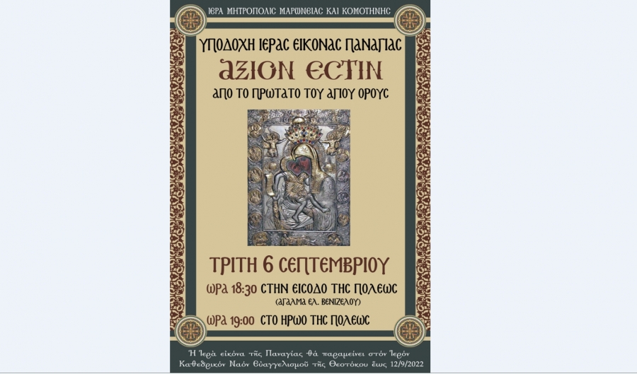 Με ιερά συγκίνηση και αισθήματα ευλάβειας ο λαός της Κομοτηνής θα έχει την χαρά και ευλογία αρχές του Σεπτέμβρη να υποδεχθεί το ιερό θεομητορικό σέμνωμα της Παναγίας, την εικόνα του Άξιον Εστίν που φυλάσσεται σήμερα στο ιερό σύνθρονο του Πρωτάτου των Καρυών.