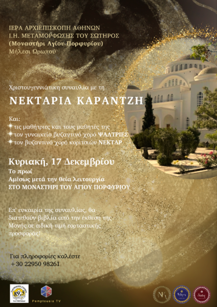 27/11/2023 27/11/2023 Στο Μοναστήρι του Αγίου Πορφυρίου, το Ιερό Ησυχαστήριο Μεταμορφώσεως του Σωτήρος, στο Μήλεσι Ωρωπού, θα πραγματοποιηθεί μια ξεχωριστή χριστουγεννιάτικη συναυλία, την Κυριακή, στις 17 Δεκεμβρίου το πρωί, ακριβώς μετά τη θεία λειτουργία (περίπου στις 11 π.μ.). Η Νεκταρία Καραντζή, μαζί με τις μαθήτριες και τους μαθητές της θα ψάλουν βυζαντινούς ύμνους των ημερών και κάλαντα...