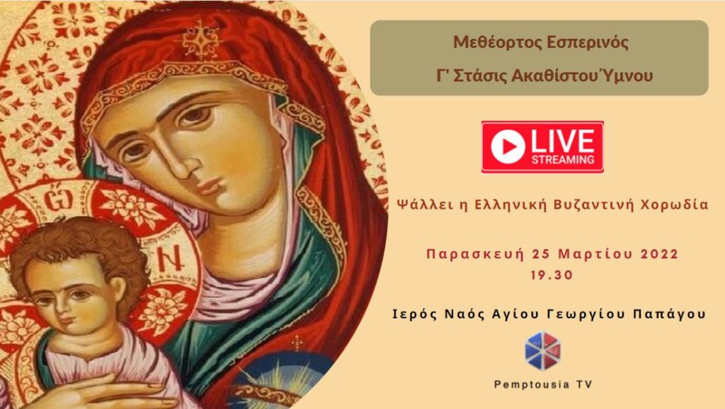 Ολοκληρώθηκε η Γ’ Στάση των Χαιρετισμών που μεταδόθηκε από τον Ιερό Ναό Αγίου Γεωργίου Παπάγου μέσα από την ψηφιακή πλατφόρμα της Pemptousia TV το απόγευμα της Παρασκευής 25 Μαρτίου 2022.