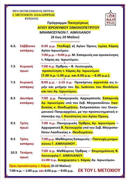 Την ιερά μνήμη του Οσίου Ιερωνύμου του Σιμωνοπετρίτου πανηγυρίζει αύριο, Τρίτη 9 Μαΐου, η Εκκλησία μας. Στην Αττική επίκεντρο των λατρευτικών εκδηλώσεων είναι το Σιμωνοπετρίτικο Μετόχι της Αναλήψεως του Κυρίου στον Βύρωνα.