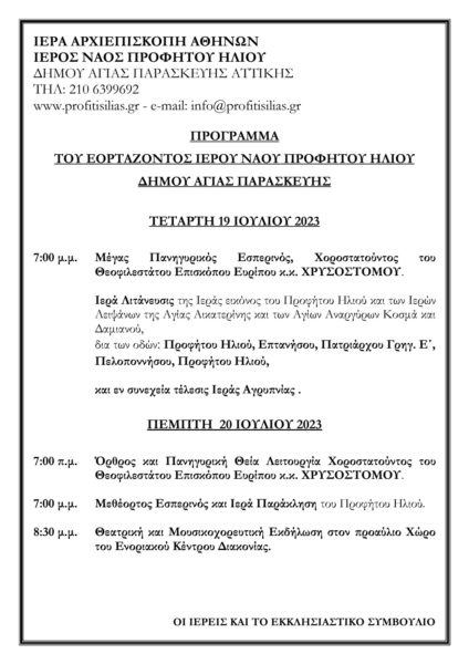 Τον Μέγα Πανηγυρικό Εσπερινό και την ιερά λιτανεία που θα τελεστούν αύριο, Τετάρτη 19 Ιουλίου 2023, στον Ιερό Ναό Προφήτη Ηλία Αγίας Παρασκευής ομωνύμου Δήμου Αττικής, θα μεταδώσει ζωντανά, από τις 19:00 έως 21:00, η ψηφιακή τηλεόραση της Pemptousia TV και το Πρακτορείο ΟΡΘΟΔΟΞΙΑ (ope.gr).