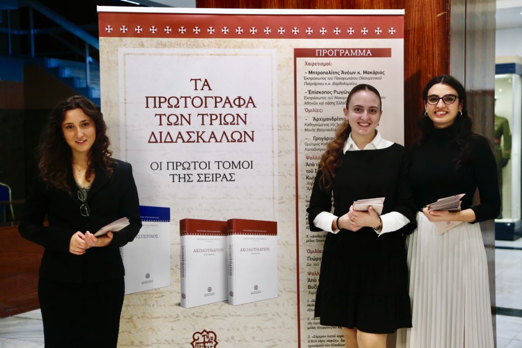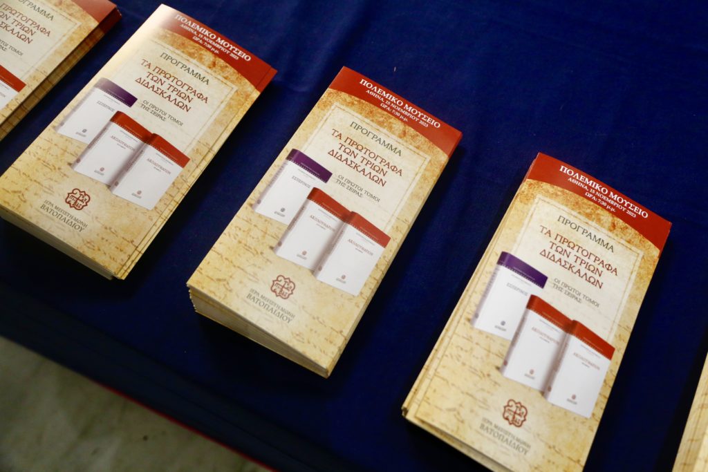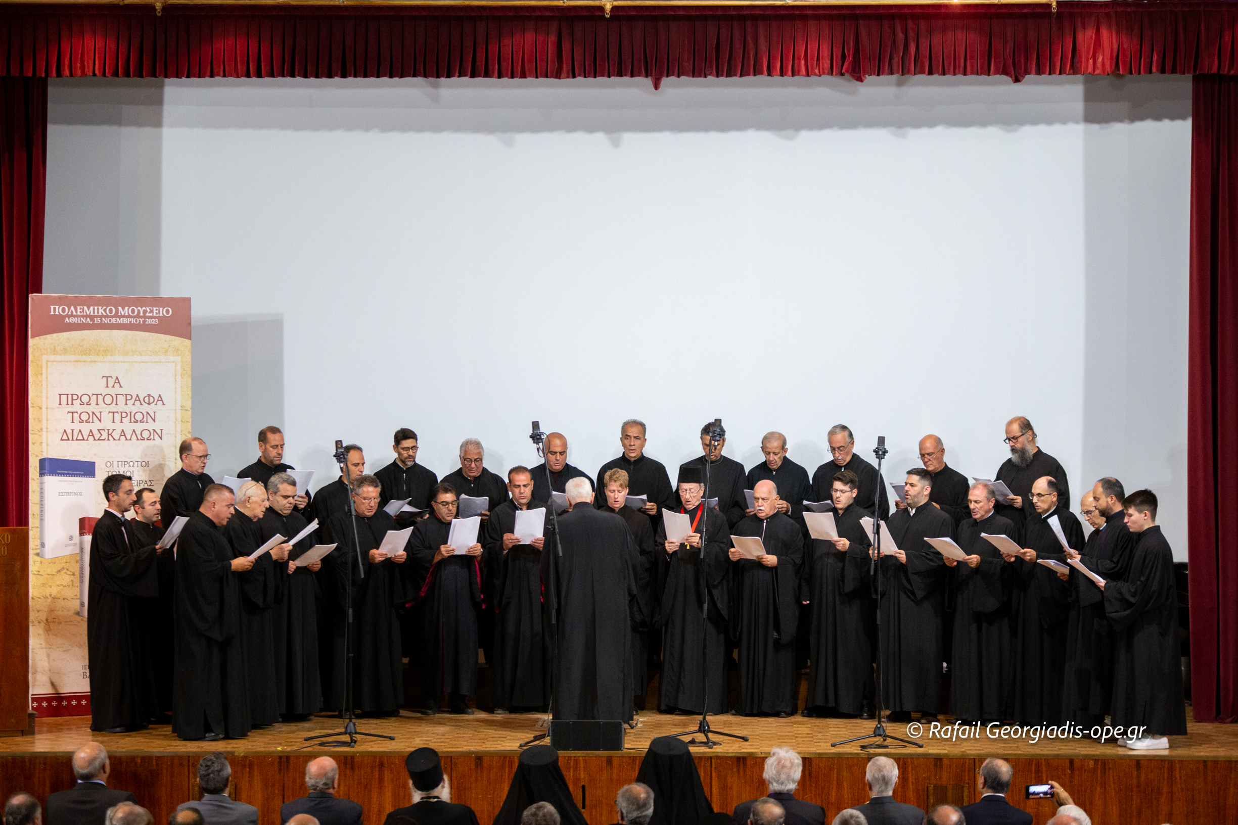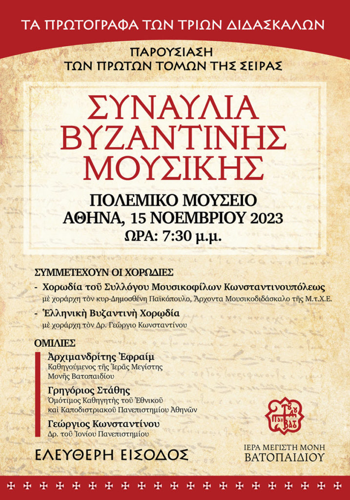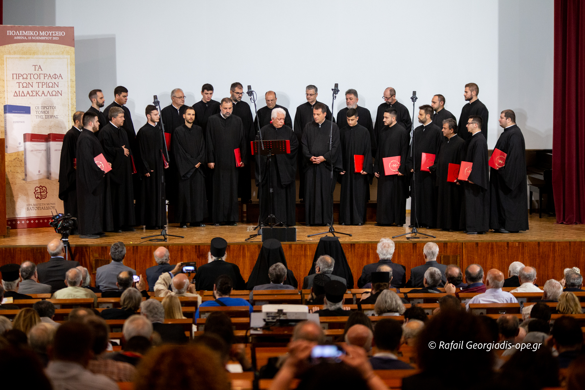 Η Ιερά Μεγίστη Μονή του Βατοπαιδίου, «υπείκουσα εις την εδραίαν μουσικήν παράδοσιν» που πηγάζει από το Οικουμενικό Πατριαρχείο, στο πλαίσιο της νέας της εκδοτικής σειράς με τίτλο ΤΑ ΠΡΩΤΟΓΡΑΦΑ ΤΩΝ ΤΡΙΩΝ ΔΙΔΑΣΚΑΛΩΝ Γρηγορίου Πρωτοψάλτου, Χουρμουζίου Χαρτοφύλακος και Χρυσάνθου του εκ Μαδύτων, διοργάνωσε εκδήλωση παρουσίασης των τριών πρώτων τόμων και Συναυλία Βυζαντινής Μουσικής στο Πολεμικό Μουσείο της Αθήνας το απόγευμα της Τετάρτης 15 Νοεμβρίου 2023.