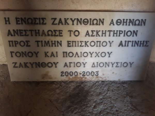 Οι Αιγινίτες αγαπούν πολύ τον Άγιο Διονύσιο, καθώς η παρουσία του ήταν συνυφασμένη με τη γιατρειά των πληγών τους! Ο Αρχιεπίσκοπος Διονύσιος ο εκ Ζακύνθου εγκαταστάθηκε το 1576 στη Μητρόπολη της Παλιαχώρας, στην Επισκοπή Αιγίνης. Την εποχή εκείνη οι καταστροφές του Μπαρμπαρόσσα, οι σφαγές και η αιχμαλωσία 4.000 κατοίκων ήταν νωπές ακόμα στη μνήμη των Αιγινητών. Μέσα στο διάστημα των τριών χρόνων που παρέμεινε στην Αρχιεπισκοπή Αιγίνης, ο Διονύσιος κατάφερε να την μετατρέψει σε πνευματικό κέντρο και χώρο λατρείας. Εμψύχωνε και παρηγορούσε τους πληγωμένους Αιγινήτες, τους δίδασκε, τους στήριζε και τους χάριζε ελπίδα. Σήμερα στην Παλιαχώρα της Αίγινας σώζονται ο πέτρινος θρόνος του έξω από την Επισκοπή, στον οποίο καθόταν και δίδασκε με πατρική φροντίδα το ποίμνιό του, καθώς και το κελί του, το Επισκοπείον.
