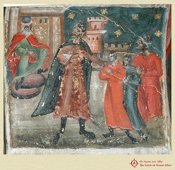 Όσιος Φιλόθεος ο Διονυσιάτης • Σκηνές του βίου του: Η παρουσίαση των δύο αδελφών στον Τούρκο αξιωματικό. Τοιχογραφία • Μονή Πέτρας Αγράφων, καθολικό • 1789