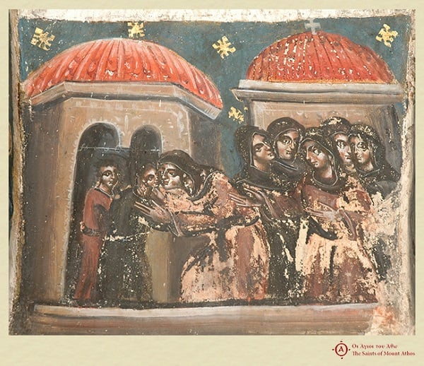 Όσιος Φιλόθεος ο Διονυσιάτης • Σκηνές του βίου του: Η αναγνώριση των παιδιών από τη μητέρα τους. Τοιχογραφία • Μονή Πέτρας Αγράφων, καθολικό • 1789