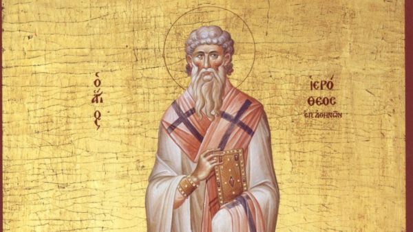«Δύο σπουδαίες προσωπικότητες της πρώτης χριστιανικής ζωής και παράδοσης, που θα μπορούσαμε να τους χαρακτηρίσουμε ως Αποστολικούς Πατέρες του 1ου αιώνα μ. Χ. εορτάζει η Εκκλησία την 3η και την 4η Οκτωβρίου. Προηγείται ο μαθητής, ο άγιος Διονύσιος ο Αρεοπαγίτης. Έπεται ο δάσκαλος, ο άγιος Ιερόθεος, πρώτος επίσκοπος Αθηνών.