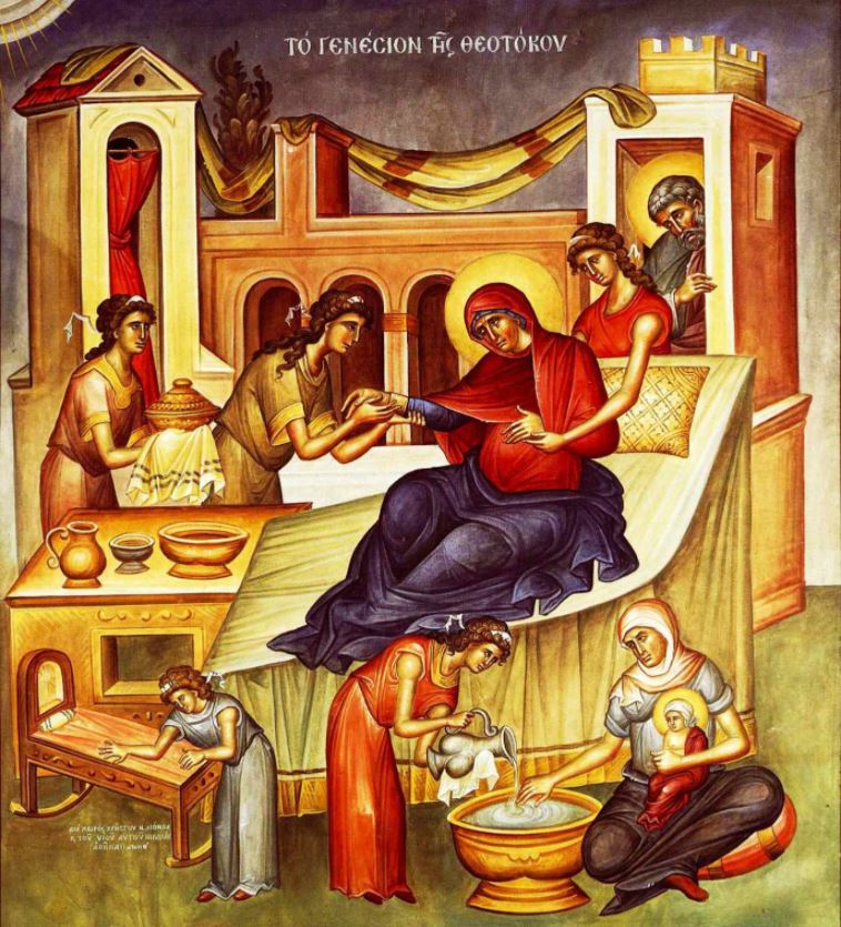 Συμμετέχουμε και εμείς μυστικά, καρδιακά, προσευχητικά, λατρευτικά σ’ αυτή την παγκόσμια χαρά. Προσκυνούμε, όπως λένε τα γράμματα της Εκκλησίας μας, τα σπάργανα με τα οποία περιεβλήθη άμα τη γεννήσει της η Κυρία Θεοτόκος. Την ευχαριστούμε, διότι εκ κοιλίας μητρός δόθηκε στον Θεό. Και εξ αυτών των νηπιακών και βρεφικών της ετών προσφέρθηκε ολόκληρη στον Θεό. Και έτσι συνεχίζουσα την αγιότητα του αγίου Ιωακείμ και της αγίας Άννας, των θεοπνεύστων και θεοκηρύκων γονέων της, έγινε και εκείνη ο «θεόβλαστος καρπός» της παρθενίας, η Μητέρα του Λυτρωτή.