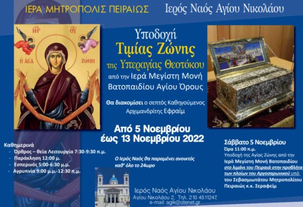 Το μοναδικό θεομητορικό κειμήλιο από την επίγεια ζωή της Παναγίας μας θα εξέλθει από το Άγιον Όρος για πρώτη φορά μετά την περίοδο της πανδημίας. “Μετά την πανδημία έρχεται στην πόλη μας το μέγιστο Θησαύρισμα η Αγία Ζώνη της Παναγίας μας”, επεσήμανε ο Σεβασμιώτατος, ενώ για την επίσημη υποδοχή που θα γίνει στις 11 το πρωί του Σαββάτου, 5 Νοεμβρίου, από την πύλη Ε9 στο λιμάνι του Πειραιά, είπε: ”Θα υποδεχθούμε την Αγία Ζώνη με τιμές Αρχηγού Κράτους όπως της αρμόζει”.
