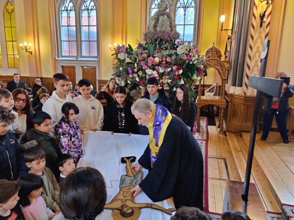 β) στα μικρά παιδιά που τύλιξαν ευλαβώς στη σινδόνη το Σώμα του Κυρίου, στην ακολουθία της Αποκαθήλωσης,