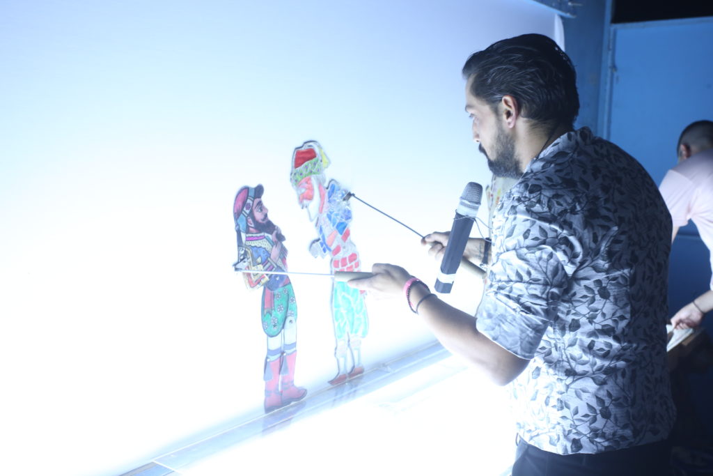 Πίσω από τον μπερντέ ο δεξιοτέχνης Καραγκιοζοπαίχτης Κώστας Σπυρόπουλος.