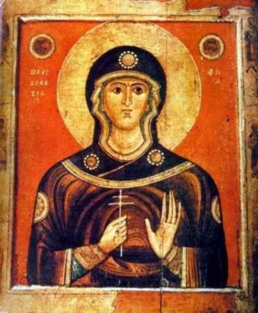 Με την δύναμη του Σταυρού και όπλο την πίστη της η Μάρτυς κατετρόπωσε το τέχνασμα του αρχεκάκου διαβόλου χτυπώντας και καταπτύοντάς τον.