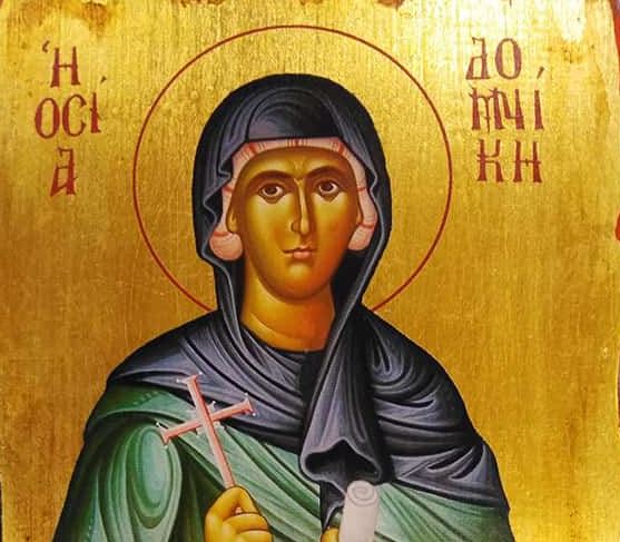 Η Οσία Δομνίκη γεννήθηκε στην Καρθαγένη της Αφρικής το 384 μ.Χ. και σε νεαρή ηλικία πήγε στην Κωνσταντινούπολη και έγινε μοναχή. Διακρίθηκε για την πίστη στο Χριστό και το ζήλο της για τη ζωή της Εκκλησίας, καθώς επίσης για τη φιλανθρωπία και την αγνότητά της.