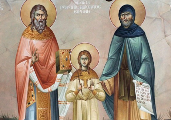 Οι Άγιοι Ραφαήλ, Νικόλαος και Ειρήνη συγκαταλέγονται στη χορεία των Νεοφανών Αγίων και μάλιστα εκείνων που μαρτύρησαν σχεδόν αμέσως μετά την άλωση της Κωνσταντινουπόλεως. Σχετικά με τον βίο τους γνωρίζουμε λίγα πράγματα. Οι πρώτες πληροφορίες για την ύπαρξη των Αγίων ιστορούνται με θαυματουργικό και αποκαλυπτικό τρόπο από το έτος 1959 μ.Χ. Από μία ανασκαφή που έγινε στη Θερμή της Λέσβου, ανακαλύφθηκε ο τάφος ενός αγνώστου προσώπου, που όπως αποκαλύφθηκε σε συνεχή οράματα, ανήκε στον Άγιο Ιερομάρτυρα Ραφαήλ, ο οποίος μαρτύρησε μαζί με τον Άγιο Οσιομάρτυρα Νικόλαο και την Αγία Ειρήνη. Ο τάφος και το λείψανο του Αγίου Νικολάου ανακαλύφθηκε στις 13 Ιουνίου 1960 μ.Χ.