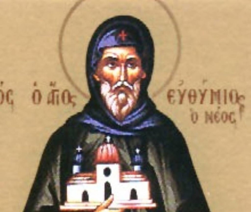 Σήμερα, 15 Οκτωβρίου, η εκκλησία μας τιμά τον Άγιο Ευθύμιο τον νέο. Γεννήθηκε στις μέρες του αυτοκράτορα του Βυζαντίου Λέοντα Ε’ του Αρμενίου (813 – 820), σε κάποια κωμόπολη της Γαλατίας, την Οψώ, που ήταν κοντά στην Άγκυρα (σημερινή πρωτεύουσα της Τουρκίας). Οι γονείς του ήταν πλούσιοι και ευσεβείς, και ονομάζονταν Επιφάνιος και Άννα. Είχαν και δυο κόρες, την Μαρία, που ήταν πρεσβυτέρα και την Επιφάνια.