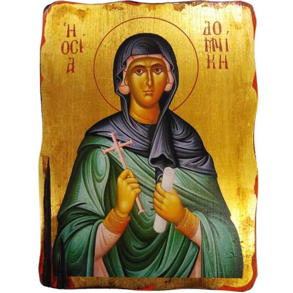 Η Οσία Δομνίκη γεννήθηκε στην Καρθαγένη της Αφρικής το 384 μ.Χ. και σε νεαρή ηλικία πήγε στην Κωνσταντινούπολη και έγινε μοναχή. Διακρίθηκε για την πίστη στο Χριστό και το ζήλο της για τη ζωή της Εκκλησίας , καθώς επίσης για τη φιλανθρωπία και την αγνότητά της. Η ηθική καθαρότητα και η ταπεινοφροσύνη της, συνδυασμένη με τα θαύματα, που η χάρις του Αγίου Πνεύματος την αξίωσε να επιτελεί, την κατέταξαν στο χορό των Αγίων.