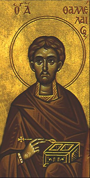 Ο Άγιος Θαλλέλαιος έζησε στα χρόνια του βασιλέως Νουμεριανού και καταγόταν από το Λίβανο (Φοινίκη). Σπούδασε ιατρική και διακονούσε με αγάπη, υπομονή και φιλανθρωπία τον πάσχοντα συνάνθρωπό του. Καταγγέλθηκε στον άρχοντα Θεόδωρο για τη χριστιανική του ιδιότητα, και αυτός τον κάλεσε να θυσιάσει στα είδωλα. Ο Άγιος αντιστάθηκε με απαράμιλλη παρρησία και πίστη στον Αναστημένο Κύριο. Αποτέλεσμα ήταν να συρθεί στο μαρτύριο. Δέχθηκε με ανδρεία πολλά και φρικτά βασανιστήρια. Τέλος, αφού τον κρέμασαν, κι ενώ πίστευαν πως είχε ξεψυχήσει, εκείνος παρέμενε ζωντανός δοξολογώντας τον Τριαδικό Θεό.