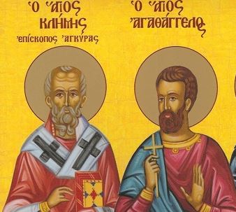 Ο δε Αγαθάγγελος καταγόταν από τη Ρώμη και έγινε χριστιανός από τον Άγιο Κλήμεντα, τον όποιο ακολούθησε. Συμμερίστηκε μάλιστα τις περιπέτειες του και τα βασανιστήρια του, και πέθανε μαζί του με αποκεφαλισμό.Η Σύναξή τους τελείται στο Μαρτύριο, το οποίο βρίσκεται στην περιοχή Ευδοξίου, πέραν του Ανάπλου και στην Εκκλησία της Αγίας Ειρήνης, της παλαιάς και της νέας.